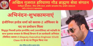 सिद्धपुर निवासी हरदेव हरगोबिंद शर्मा (नारनोलिया) को पदोन्नति के साथ गुजरात सरकार के सिंचाई विभाग में उप कार्यकारी अभियंता (सिविल) क्लास-2 (Deputy Executive Engineer (Civil) Class-II) के पद पर नियुक्त किया गया, जसदण, राजकोट में पंचायत सिंचाई सर्कल उप-विभाग में वरिष्ठता के अनुसार पदोन्नति के साथ स्थानांतरित किया गया। 28 जून को आदेश हुआ जारी, अब हरदेव भाई जसदण(राजकोट) में देंगे सेवाएं। इससे पहले, हरदेव शर्मा मेहसाणा सुजलाम सुफलाम योजना के अतिरिक्त सहायक अभियंता (सिविल) के रूप में कार्यरत थे।